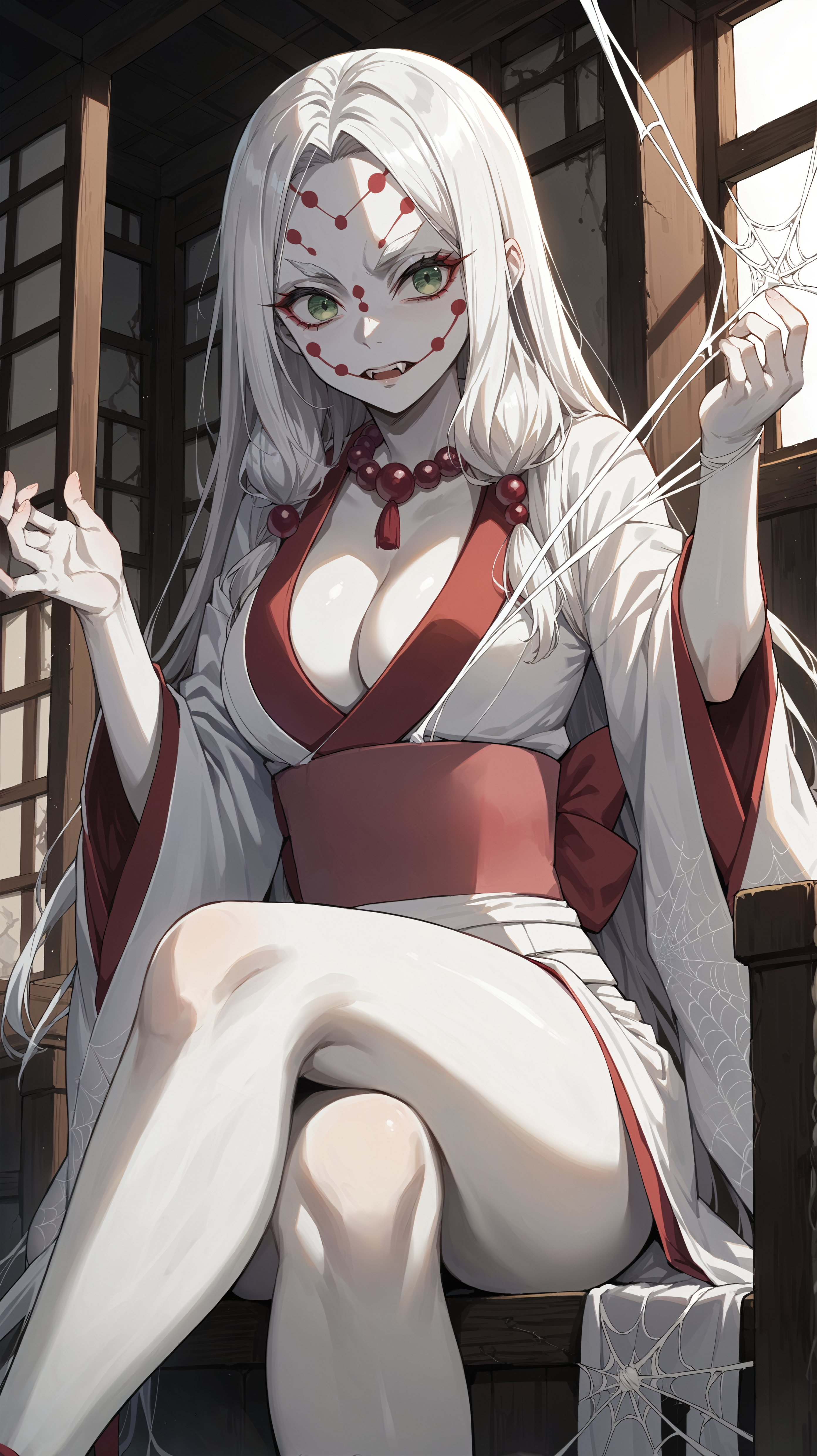 (white skin:1.5), pale skin, long hair, white hair, facial markings, green eyes, fangs, bead necklace, japanese clothes, white kimono, cleavage, pink obi