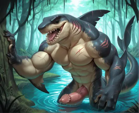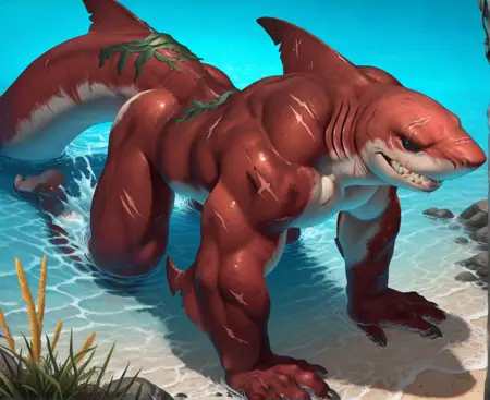 포니 태그: 상어, 늑대상어, 인간형, 날카로운 이빨, 검은 눈, 작은 눈, 상어 지느러미, 꼬리, 상어 꼬리, 아가미, 발톱, 근육질 등...