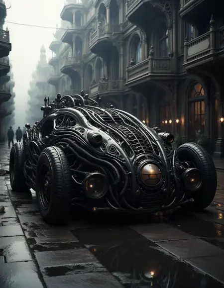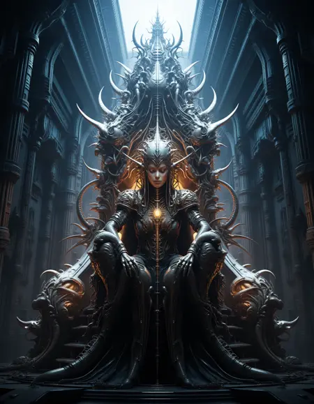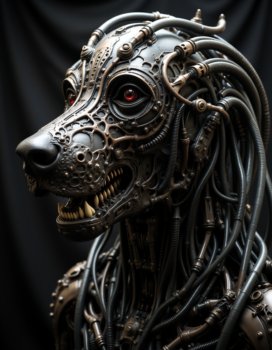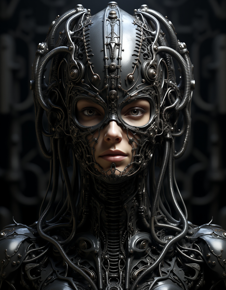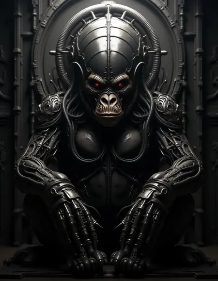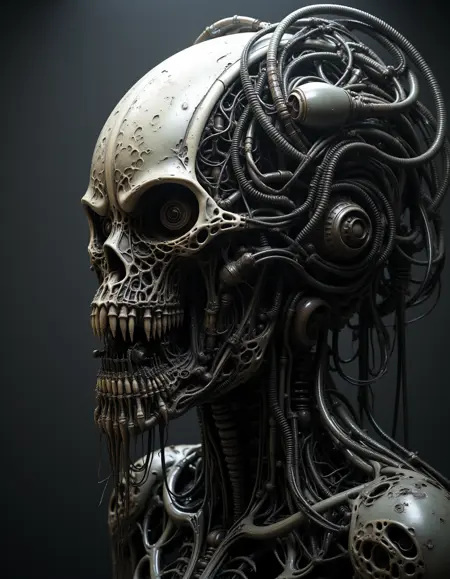 此Lora受吉格尔风格启发,但训练并未使用他的画作。事实上,这是一种摄影风格而非艺术风格,因此被称为Giger 2.0。它向H.R.吉格尔的标志性作品致敬,同时融入了现代、未来主义的审美。在这一更新版本中,流畅的金属元素与有机形态的融合更加精致,注重对称性与技术精确性。纹理更为平滑,但导线、电缆和机械部件的复杂性依然保留,唤起一种外星智慧或先进赛博生命体的氛围。这种风格 encapsulates(浓缩)了赛博幻想的核心——科技与生物不可分割地交织在一起。