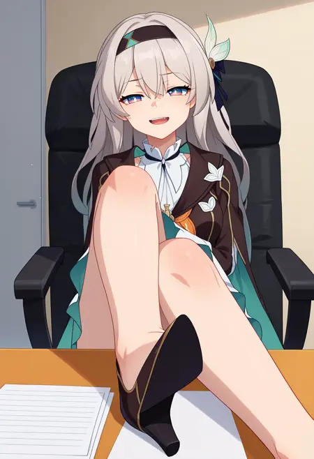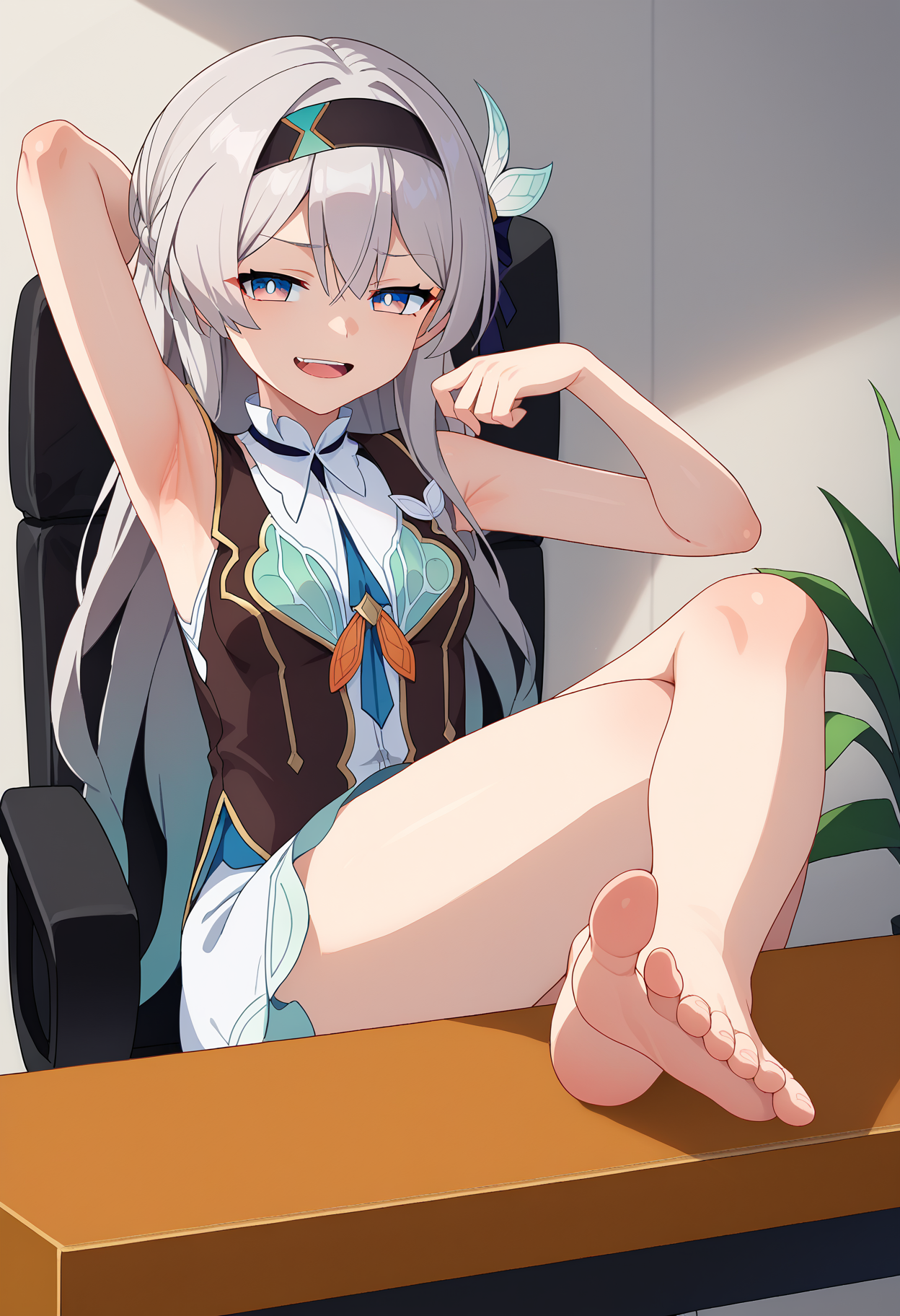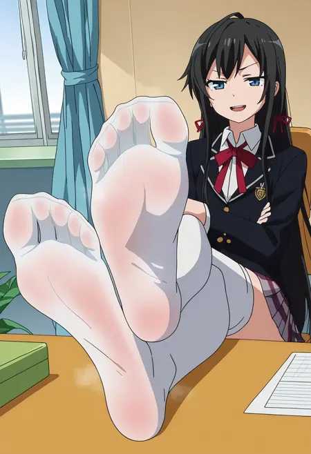 crosft, feet on table, full body, crossed legs, sitting, legs, foot focus, foreshortening, thighs, feet, toes, soles,