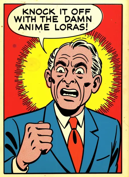 我在图像选择上非常谨慎,并在 Photoshop 中对每张图像进行了预处理,以突出鲜艳色彩、减少泛黄并增强对比度。这有助于保持色彩一致性,我认为也提升了训练质量。在此过程中,我还移除了部分训练数据中对话气泡内的文字,以增加灵活性并帮助 Flux 理解上下文。你可以在提示中明确写入“empty speech bubble”,通常效果良好。若想深入探索,可尝试使用图像标注器描述你希望模仿的风格——这些图像拥有丰富的标注文本,模型对自然语言提示响应良好。