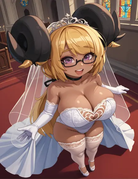 "caoimhe, 山羊の角、金髪、巨乳、眼鏡、巻き角、肌の黒い女性、ブラックチョーカー、半フレーム眼鏡、紫の目"