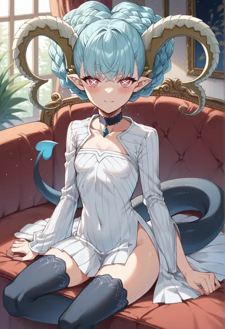 Asc1: horns, pointy ears, blue hair, symbol-shaped pupils, pink eyes, double bun, braid, choker, short dress, white dress, long sleeves, thighhighs, tail