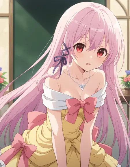(kisara,pink_hair,red_eyes,very_long_hair,hair_ribbon,:1.0),(yellow_strapless_dress,pink_bow,off_shoulder,flower_pendant,:1.0),