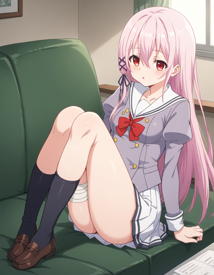 (kisara,pink_hair,red_eyes,very_long_hair,hair_ribbon,:1.0),(bandaged_leg,black_socks,grey_shirt,pleated_skirt,puffy_sleeves,red_bowtie,serafuku,white_sailor_collar,:1.0),