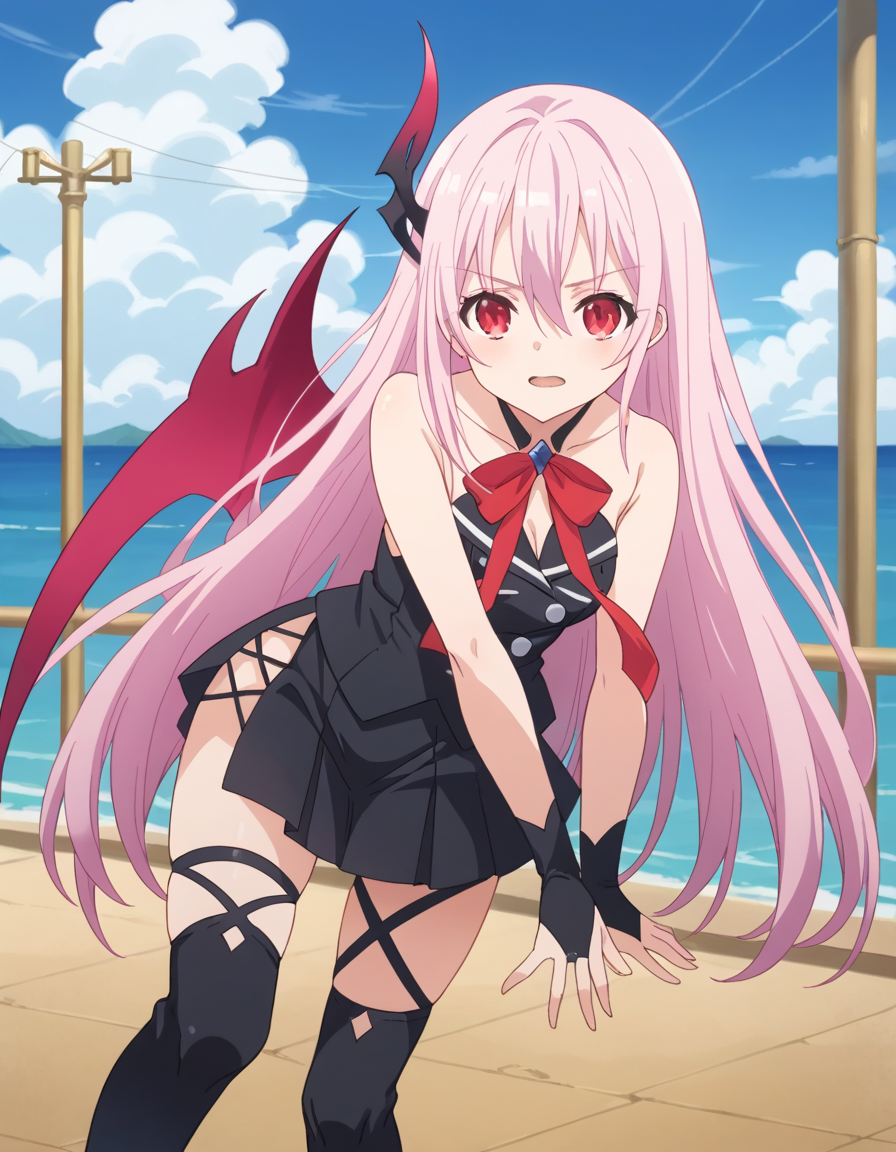 (kisara,pink_hair,light_red_eyes,very_long_hair,one_horn,one_wing,:1.0),(asymmetrical_gloves,black_boots,red_bowtie,black_halterneck_dress,sleeveless_dress,thigh_boots,:1.0),