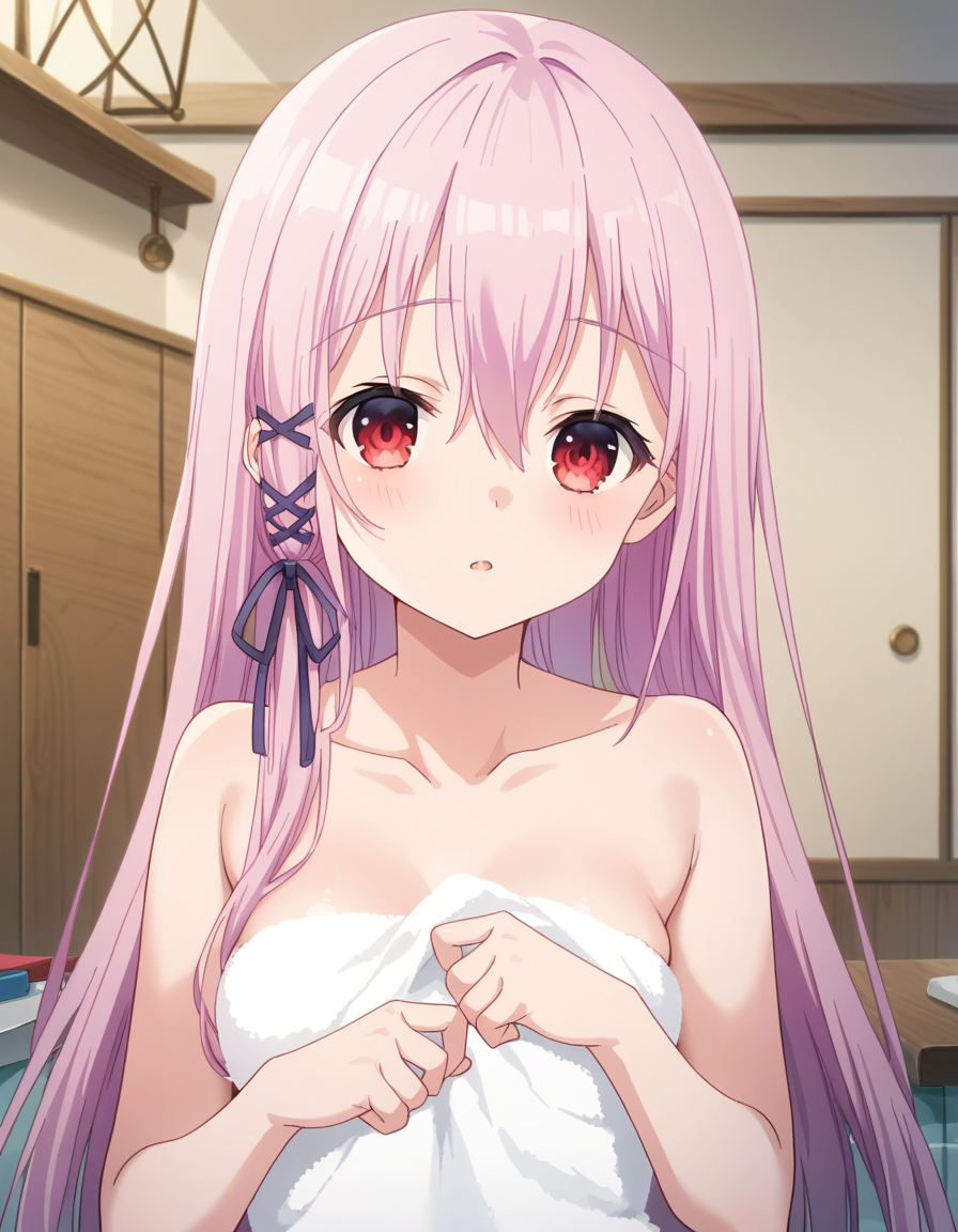 (kisara,pink_hair,red_eyes,very_long_hair,hair_ribbon,:1.0),(towel,:1.0),