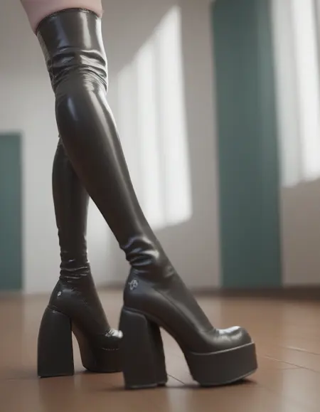 紧贴腿部的90年代风格厚底靴,采用定制设计的Naked Wolfe厚底及鞋跟结构,搭配贴合腿部的弹性上部材质。
