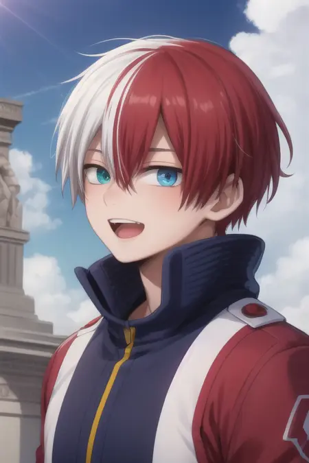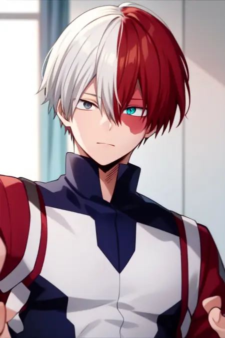 트리거 단어: 토토로키 쇼토, 1남자, 남성 중심, 분할 색상 헤어, 하얀 머리카락, 빨간 머리카락, 짧은 머리카락, 상처, 얼굴에 있는 상처, 화상 자국, 이색시, 회색 눈, 파란 눈, 눈 위의 머리카락,