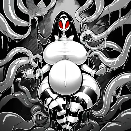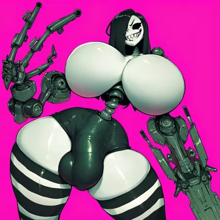 eddiestripesocks, smile, red eyes, huge breasts, wide hips, thick thighs, latex dress, shiny, short hair, hairband, striped thighhighs, narrow waist, white outline