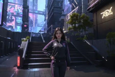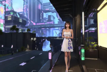 architecture, bar \(place\), bed, belt, blue sky, book, book stack, bookshelf, bottle, bridge, building, cable, car, ceiling light, chair, city, city lights, cityscape, computer, couch, crop top, cropped jacket, crosswalk, cup, dark, desk, door, east asian architecture, fence, flower, flower pot, grass, ground vehicle, halo, instrument, jacket, keyboard \(computer\), lamp, lamppost, light, lights, mecha, monitor, motor vehicle, mouse \(computer\), neon lights, night, night sky, open clothes, open jacket, outdoors, palm tree, pants, pillar, plant, potted plant, purple flower, railing, reflection, road, robot, scenery, science fiction, screen, shadow, short shorts, shorts, silhouette, sky, skyscraper, sliding doors, sparkle, speaker, stairs, star \(sky\), street, table, television, tile floor, tiles, tree, vehicle focus, water, waterfall, window,