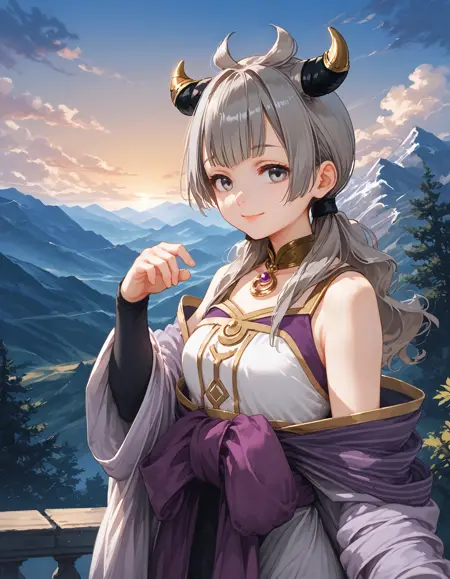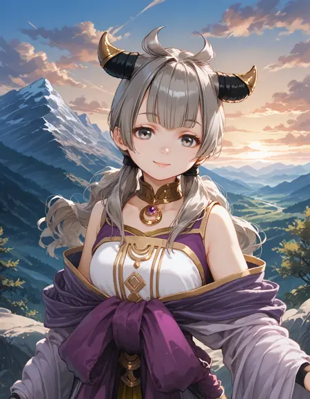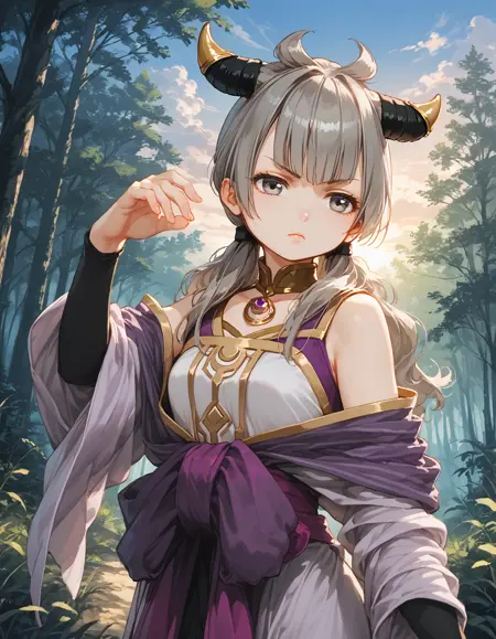 Magical outfit: mgrcsatominayuta, fake horns, black hairpins, yellow detached collar, brooch with purple gem, white with yellow sleeveless top, purple with grey bow tied shawl, black leggins