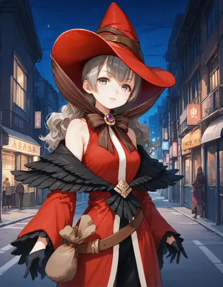 Witch outfit: mgrcsatominayuta, red witch hat, brown striped scarf, brooch with purple gem, red with white sleeveless sweater, shoulder cutout, wide red sleeves, black gloves, brown belt with bag, red with white coat with black collar, black tights