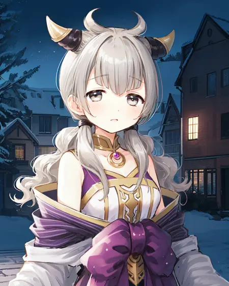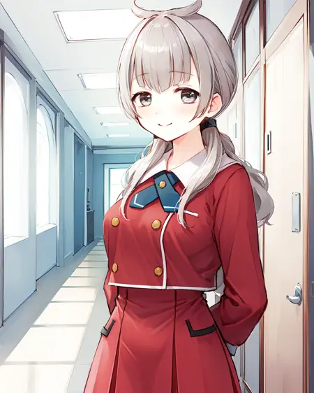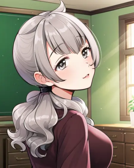 외모: 회색 머리, 회색 눈, 낮은 트윈테일