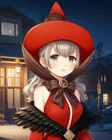 마녀 복장: mgrcsatominayuta, 빨간 마녀 모자, 갈색 줄무늬 스카프, 보라색 보석이 달린 브로치, 빨간색에 흰색 소매 없는 스웨터, 어깨 컷아웃, 넓은 빨간 소매, 검은 장갑, 갈색 벨트와 가방, 검은 칼라가 달린 빨간색에 흰색 코트, 검은 타이츠