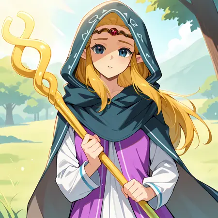 Disguise Outfit: Princess Zelda, blue eyes, blonde hair, long hair, cloak, hood up, holding staff, hooded cape, long sleeves, white shirt, circlet
