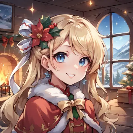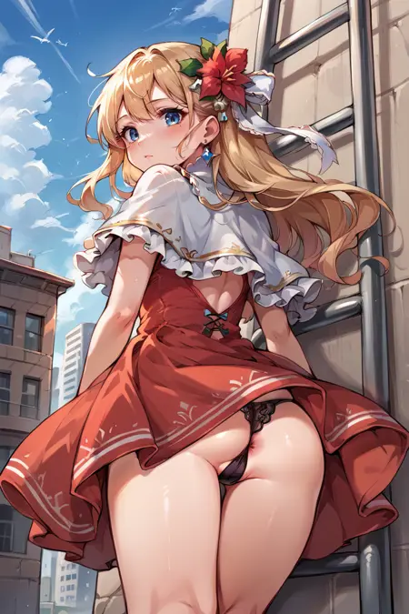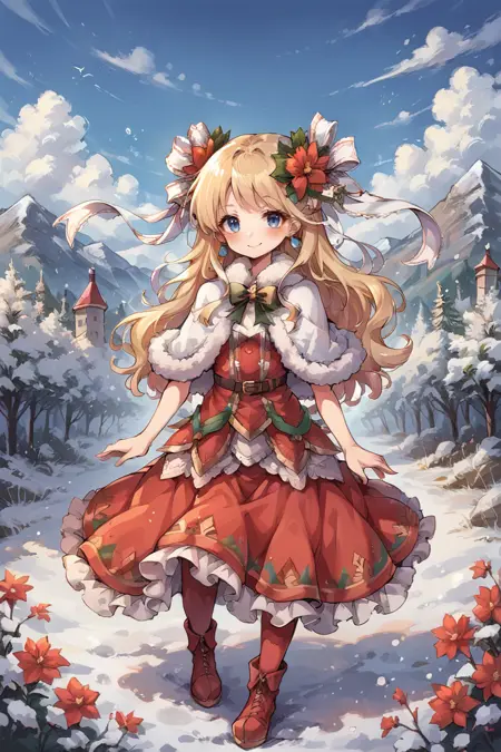 Helpful Tags: 1girl, blonde hair, blue eyes, long hair, hair ornament, hair flower, white hair ribbon, yellow neck ribbon, earrings, fur-trimmed capelet, red dress, layered dress, frilled dress, cleavage, boots