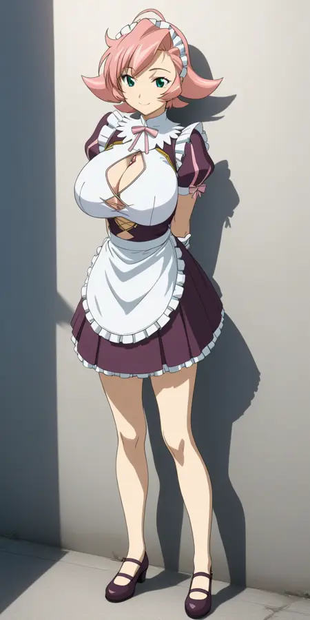 Activation tag is "asuna_arsen, short hair, pink hair, green eyes, maid outfit, dark purple outfit, revealing outfit, cleavage, huge breasts, white apron, white thighhigh, dark purple shoes, puffy sleeves, white gloves, ribbon on back,".