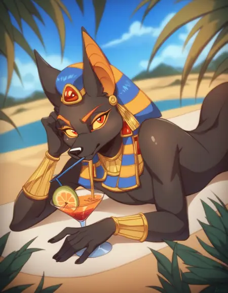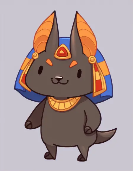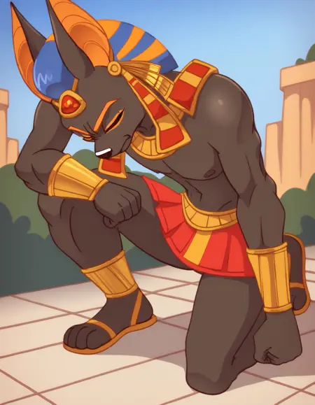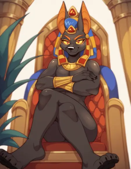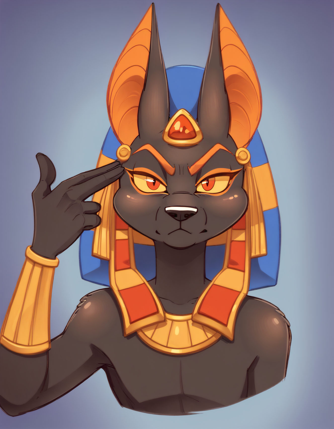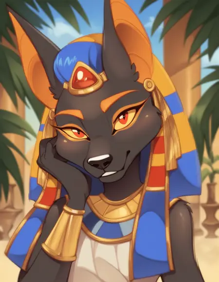 Anubis, brown fur, yellow sclera, red eyes, orange eyebrows