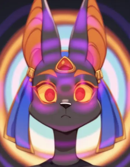 プロンプト: Anubis, brown fur, yellow sclera, red eyes, orange eyebrows.