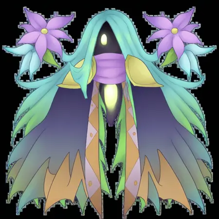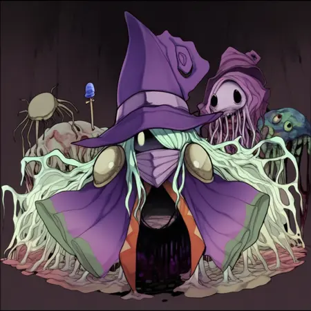 drawc1a, 1girl, solo, witch hat, yellow eyes, long hair, blue hair, purple cape, hair over one eye, scarf
