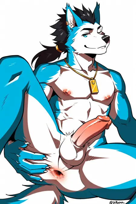 Trigger Tags: shikirowen, cyan fur, white fur, two-tone fur, male, anthro, furry male, furry, blue pupils, white sclera, black hair, animal ears, ponytail, wolf boy, wolf tail, long hair, wolf ears, animal nose, black nose