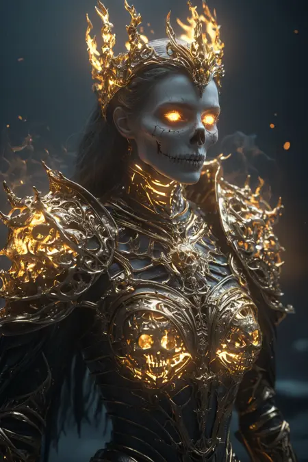 "細密な黄金の鎧をまとう、火と幽霊のような女性の骨格の女王のクローズアップ。輝く目をもつ女王の周囲には、暗い火の海に浮かぶ半透明な骨格が漂い、骨のダンジョン、墓所の内部に立っている。Unreal Engine風に、映画的で超現実的なスタイルでレンダリングされる。"