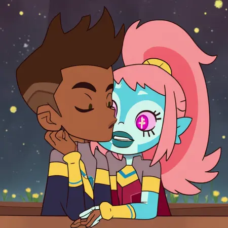 左側には、ブルーの肌とピンクの髪を高めのポニーテールにまとめたキャラクターが、手に発光する長方形のオブジェクトを構えています。大きく表情豊かなピンクの目を持ち、高めのカラーとイエローのアクセントが施されたグリーンのドレスを着ています。黄色の手袋と青い宝石付きのベルトも特徴です。表情は親しげで、もう一方のキャラクターを見つめています。