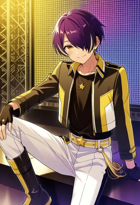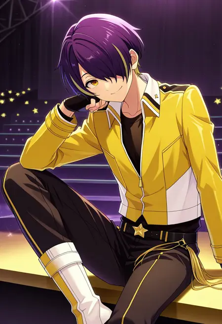 shinobu,1个男孩,男性焦点,单人,条纹发,多色发,紫色头发,黑色头发,金色头发,头发遮住一只眼睛,黄色眼睛,偶像制服,衬衫,黑色衬衫,夹克,短款夹克,黑色夹克,黄色夹克,多色夹克,敞开式夹克,项链,手套,黑色手套,无指手套,腰带,黄色腰带,星星(符号),裤子,白色裤子,靴子,黄色鞋具,