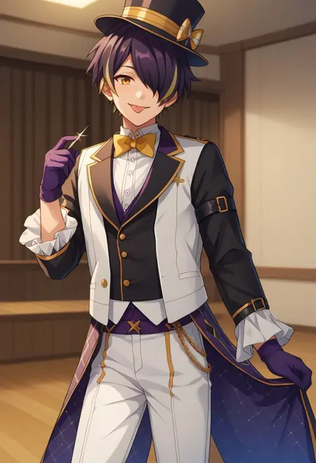 shinobu, 1boy, male focus, solo, streaked hair, multicolored hair, purple hair, black hair, blonde hair, hair over one eye, yellow eyes, idol uniform, shirt, black shirt, jacket, cropped jacket, black jacket, yellow jacket, multicolored jacket, open jacket, necklace, gloves, black gloves, fingerless gloves, belt, yellow belt, star (symbol), pants, white pants, boots, yellow footwear,