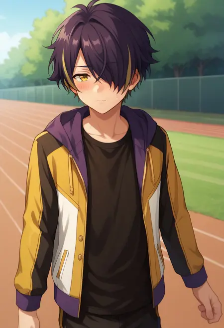 senshino, 1boy, male focus, solo, yellow eyes, short hair, streaked hair, multicolored hair, purple hair, blonde hair, hair over one eye, track suit, shirt, black shirt, jacket, track jacket, multicolored jacket, hood, black and white jacket, red hood, long sleeves, drawstring, open jacket, open clothes, pants, white pants,