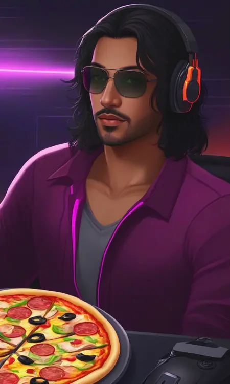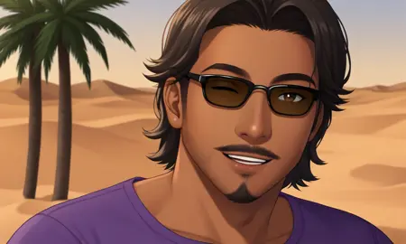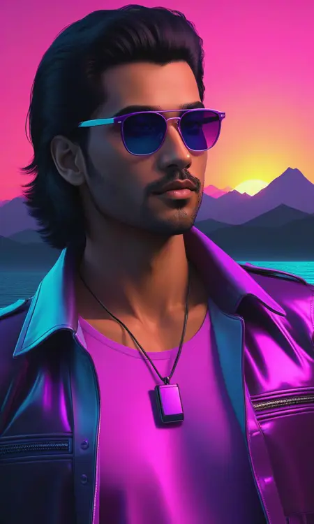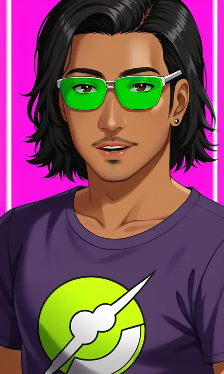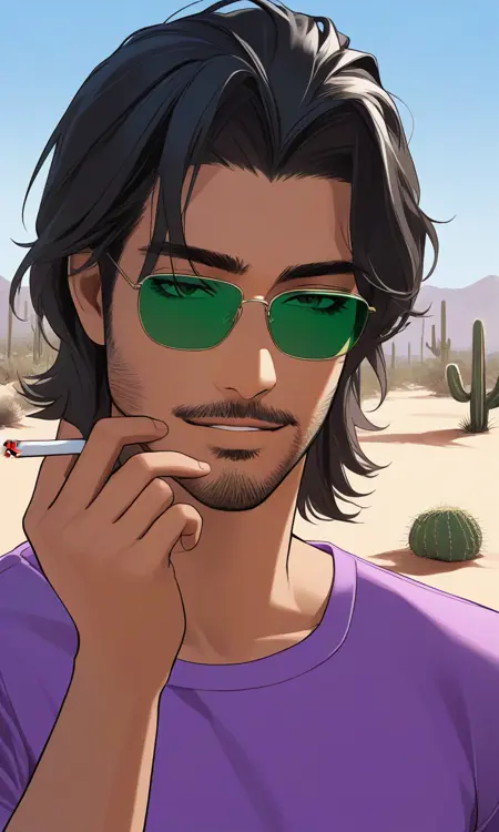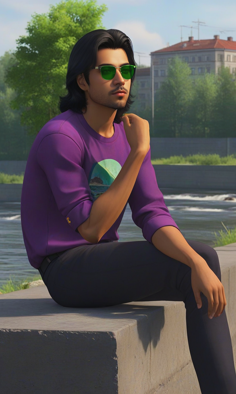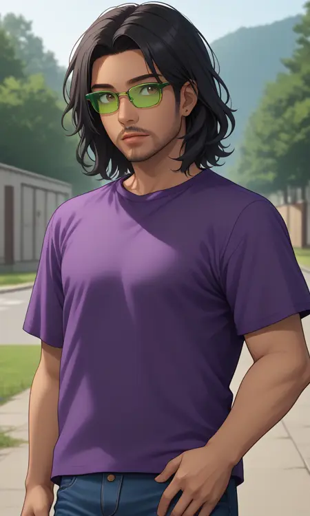 1man, black hair,((medium hair)), brown eyes, green sunglasses, ((tanned skin)), beard stubble,purple t-shirt