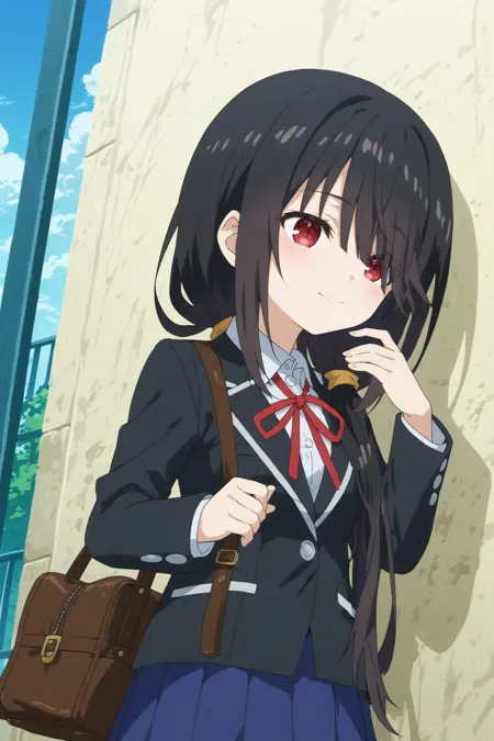 School uniform : 1girl,solo,kurumi tokisaki,school uniform, long hair, skirt, black hair, red eyes, ribbon,jacket, pleated skirt, bag, hair over one eye