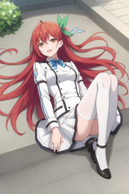 red hair, long hair, hair ribbon, black choker, golden eyes
