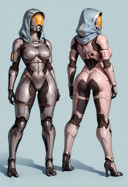 fquarian, mask, faceless, hood, breasts, helmet, bodysuit, fewer digits, skin tight, armor, blue armor, full body, standing,