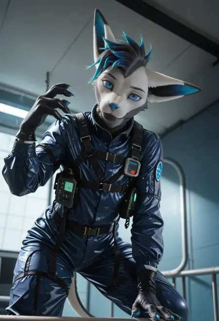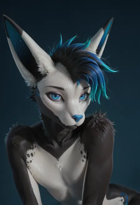 // Illustrious: krakka, mammal, body fur, anthro, furry, hi res, animal ears, solo, blue eyes, tail, multicolored hair, blue claws, blue nose, white stomach, blue side body