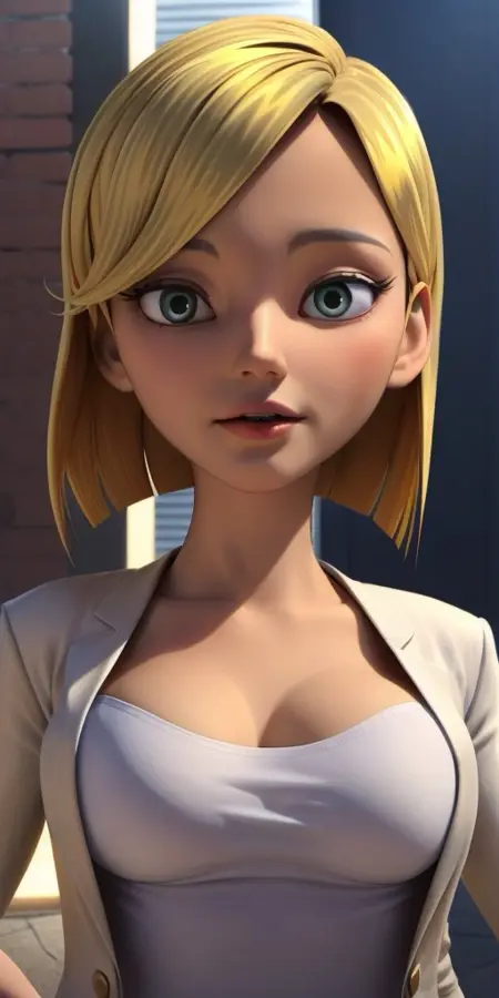 golden blonde hair is cut into a short bob that ends in the center of her neck