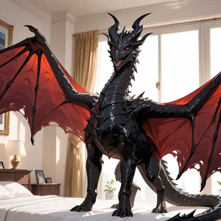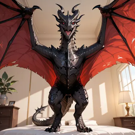 追加プロンプト:dragon, black scales, wings, horns, tail, male, 1boy, red sclera, red eyes, claws