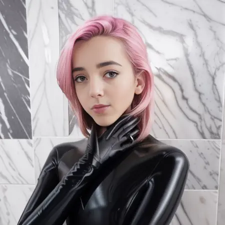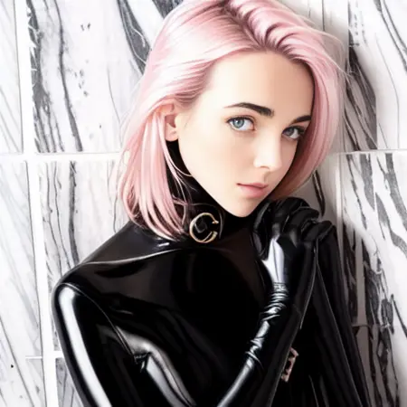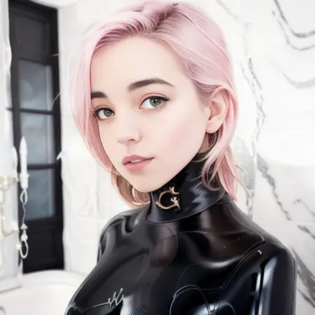 这次我为你准备了一个粉发女孩身穿黑色紧身 latex 连体衣的 TI 哦 :) 原图的背景是瓷砖浴室或类似环境,所以 TI 也倾向于相同的背景。