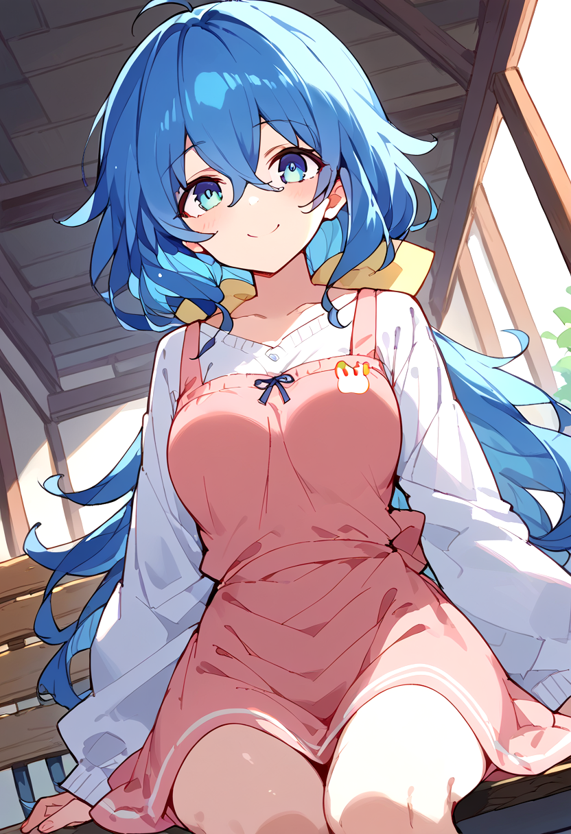 H_yoshi0n,blue hair,long hair,low ponytail,blue eyes,medium breasts,yellow ribbon,(pink apron:1.2),white sweater,