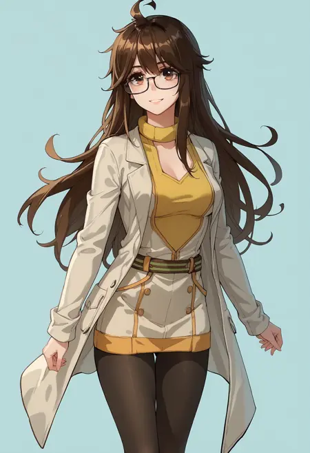 1girl, 갈색 머리, 앞머리, 긴 머리, 갈색 눈, 가슴, 안경, 검은테 안경, 실험복, 스웨터,
