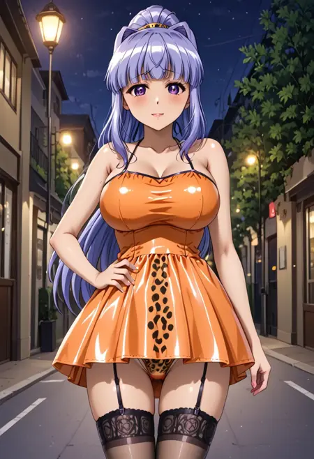 Yayoi Mizuno, feminine, sensual, purple eyes, detailed pupils, ponytail, light purple hair, very long hair, (hanging bangs, straight bangs, long sideburns, short bangs), big breasts, pale skin, blushing cheeks, nice body