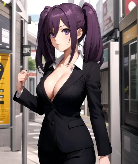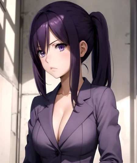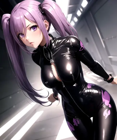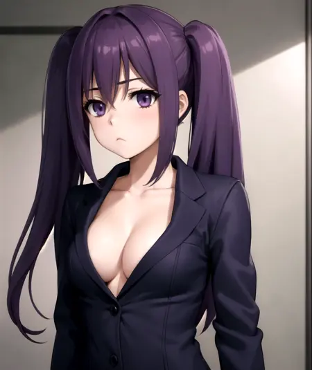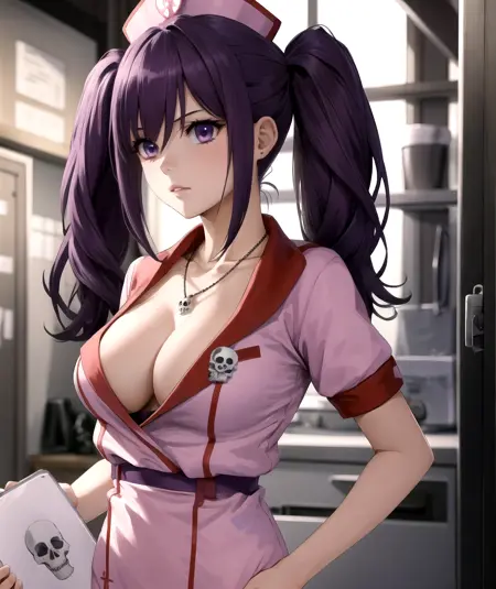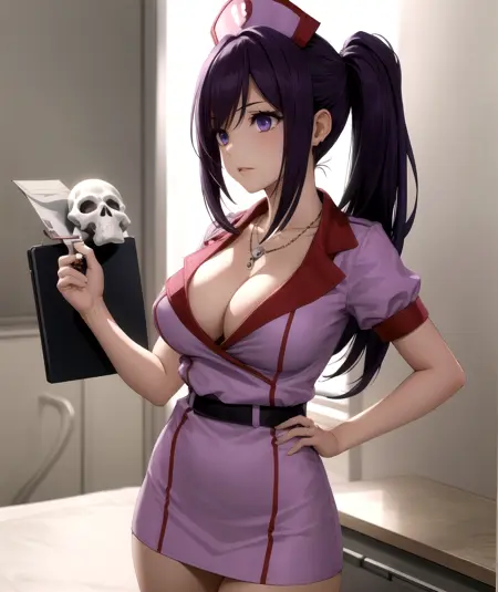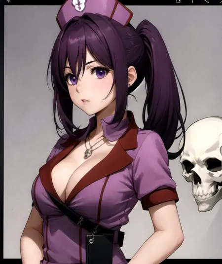 可使用以下提示词:kouzaku mitori,长发,双马尾,紫色眼睛,骷髅项链,发髻,紫色头发,护士帽,护士,校服,衬衫,刘海遮眼,夹克,黑色夹克,敞开衬衫