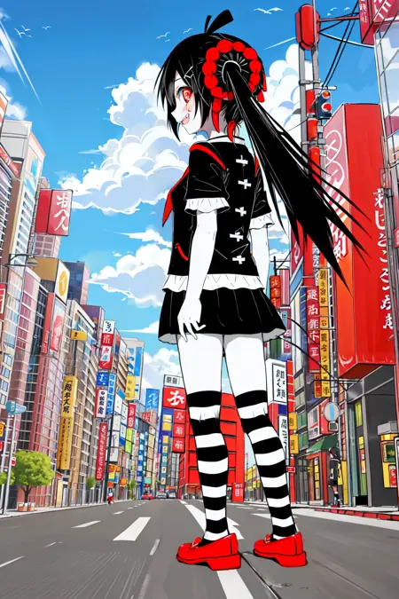 옷 태그: 내장 헤어클립, 검은 셔츠, 검은 스커트, 검은 허벅지까지 오는 양말, 가로줄 무늬 허벅지까지 오는 양말, 빨간 신발