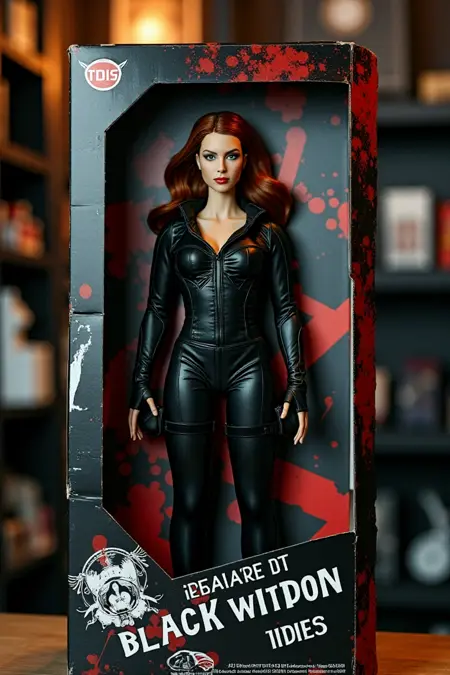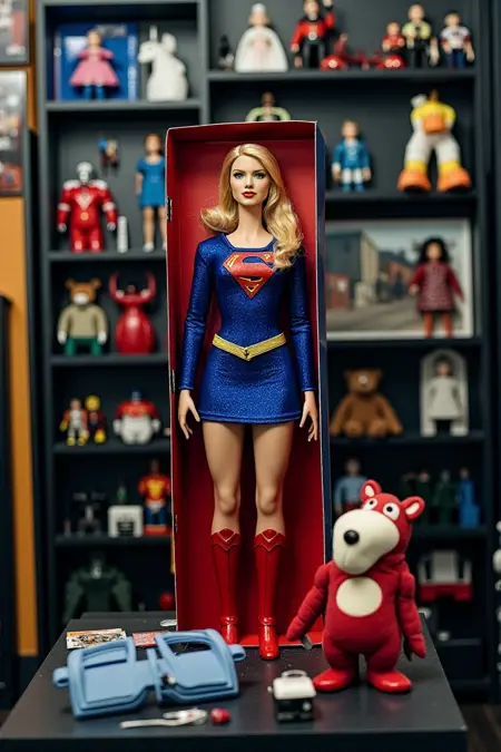 cinematic film still <lora:DollBoxRealisticQuiron_FLUX-000001:1.3> DollBoxRealisticQuiron, 礼品娃娃盒摆放着各种物品和众多配件,展示柜内凸显出一个栩栩如生的人偶。神奇女侠娃娃精准捕捉了标志性特征,呈现出惊人的写实感。旁边包装上展示了一幅半人马与龙战斗的卡通插画,为人物的真实感增添了动态对比。浅景深、暗角、高度细节、高预算、背景虚化、电影宽银幕、氛围感、史诗感、华丽、胶片颗粒、颗粒感