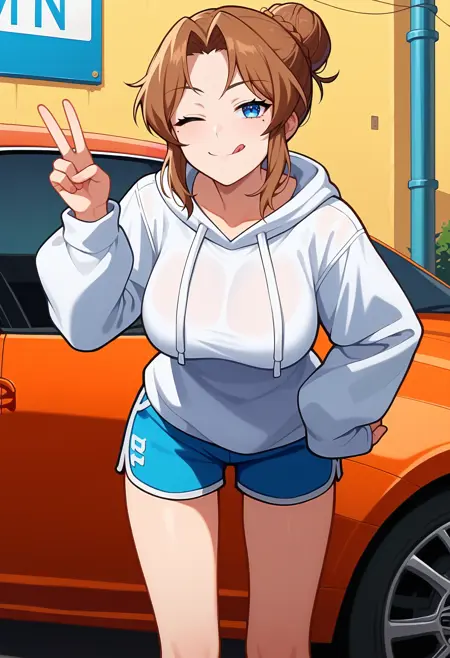 KJOclaudia, brown hair, blue eyes, mole under eye, parted bangs,
