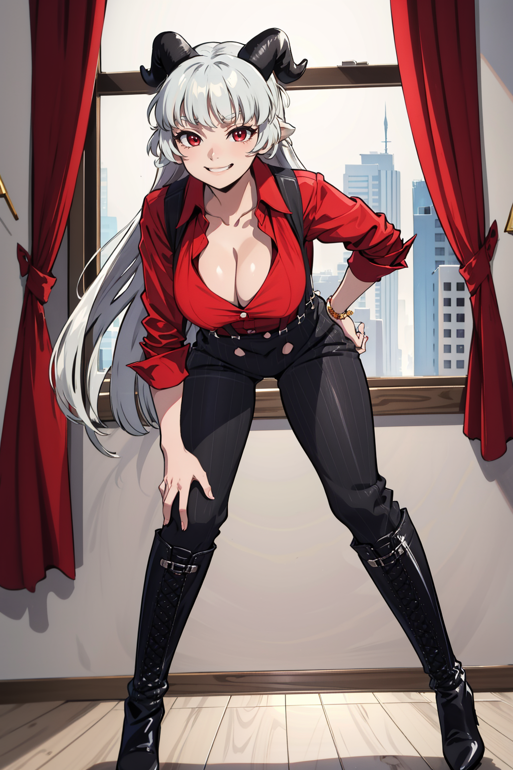 通常のスタイルの場合は、「レッドシャツ、サスペンダー、ふくらはぎ、ブラックパンツ、ハイヒールブーツ」を追加してください。
