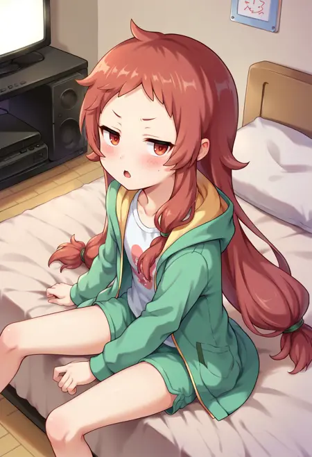 rlrin, 赤い髪, 下側で結んだ長い髪, フード下げ, フード付きジャケット, 開いたジャケット, 緑色のジャケット, 白いシャツ, 短いショートパンツ, 緑のショートパンツ,