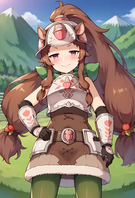 - pcrrin, サルの女の子, 下側で結んだ長い髪, rinran, ポニーテール, ヘルメット, アーマー, 胸板, グローブ, 茶色のドレス, ファーの縁取り, パンティーホース,