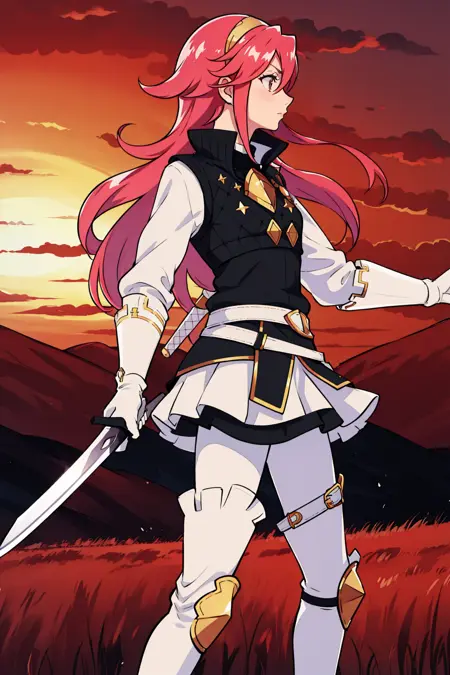 添加“发带,铠甲,白衬衫,长袖,黑色背心,腰带,白色迷你裙,白色手套,黑色连裤袜,大腿靴”以呈现她典型的造型。
